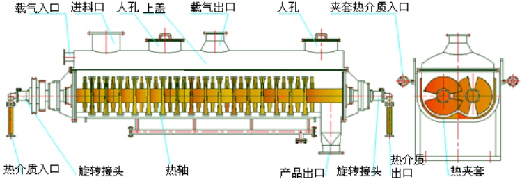 空心軸上密集排列著楔型中空槳葉,熱介質(zhì)經(jīng)空心軸流經(jīng)槳葉。單位有效容積內(nèi)傳熱面積很大,熱介質(zhì)溫度從-40℃到320℃,可以是水蒸汽,也可以是液體介質(zhì):如冰鹽水、熱水、導熱油等。間接傳導加熱,熱量主要用來加熱物料,使用極少量空氣帶走濕氣,熱量損失僅為通過器體保溫層向環(huán)境的散熱,以及少量尾氣攜帶的熱量。相互齒合的楔型槳葉之間具有互相清潔功能;而物料顆粒與楔型面的相對運動產(chǎn)生洗刷作用,能夠洗刷掉楔型面上附著物料,使運轉(zhuǎn)中一直保持著清潔的傳熱面。